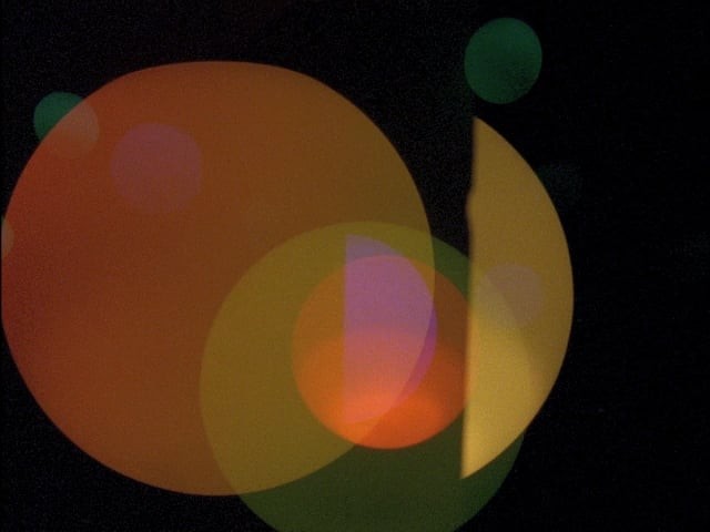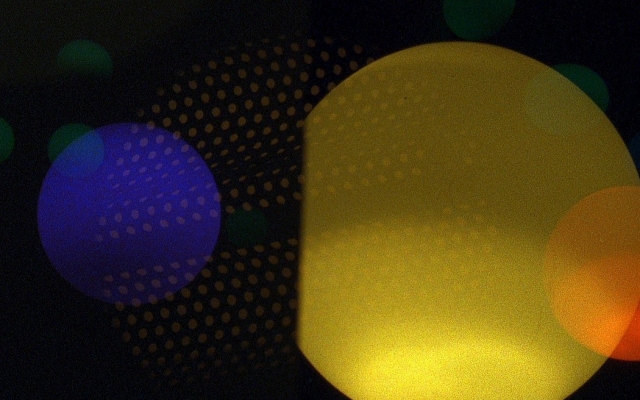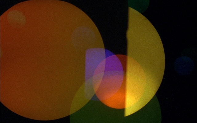 Sophie Michael UK, 2010, 8', 16 mmThe remaining features of an empty shop are choreographed to make a kaleidoscopic light film. Spherical ceiling lamps sweep across the frame, pillars provide wipes, window shutters are hole-punched stencils and passing buses shoot beams of light. Depth and scale constantly shift, and the camera mixes colours blindly as exposures multiply.