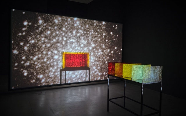 HD video, color, sound, 36 min, 5 colored glass filters, steel base