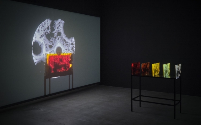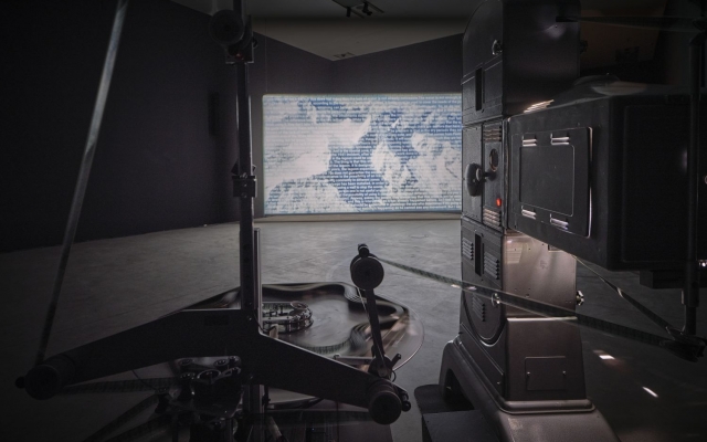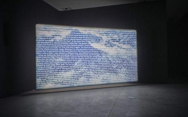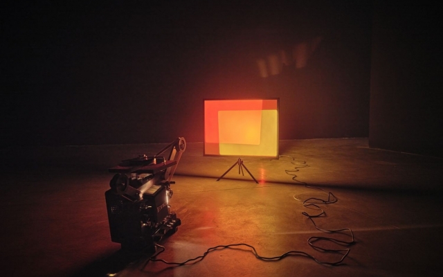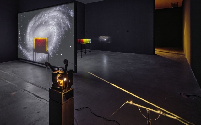 The kinetic sculpture Enterprise of Notations (2013), from a series of works influenced by structural film, establishes a space for speculation about the nature of documents and the way we perceive the flow of time. The absence of an image during the continuous projection of a blank 16-mm film creates the impression of time standing still, evoking a sense of wonder and creating space for a dialogue of associations or a poetic play of meanings. Barba’s research suggests that the tendency to speculate can also be detected in science, specifically astronomy, which, like film, involves dealing with aspects of light, time, and distance. With the video installation The Color Out of Space (2015), the author momentarily sets aside the materiality of the film strip in order to project a film composed of astronomical shots of celestial bodies through a series of colored glass panels. The soundscape is formed by a collage of intertwined narratives, which, although they seem indistinguishable and go beyond the reach of ordinary perception, establish relations between distant meanings. Color Studies (2013) is part of a body of work in which Barba explores the limits of the visible, with a particular focus on the different properties of color. As two opposing 16-mm projectors project beams of light onto a small film screen, overlapping fields of color and endlessly repeating variations create subtle abstractions that leave room for new insights. Aggregate States of Matters (2019), a 35-mm film shot in the Peruvian Andes, refers to the physical conditions of the landscape already in its title, as well as to the consequences of melting glaciers on the collective experience of life of rural Quechua communities, which are among the most threatened by climate uncertainty. The parallel between a celluloid tape and the impressive landscape, permanently inscribed on it – a landscape that is disappearing at an incredible rate – is explicitly emphasized by the film installation which, in an attempt to extend the lifespan of nature, shares with film its fragility and impermanence.