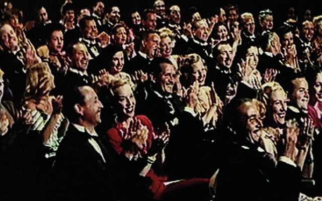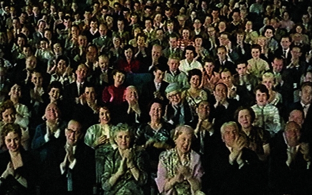 Audience at the movies. In Play, the on screen action can only be seen reflected in the facial expressions and gestures of the audience. In sequences of analogous reactions, individual behavior condenses into collective behavior. The event is transferred from the stage to the hall; audience members become the actors in an unpredictable drama.