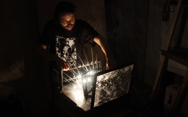 The second performance by Optical Machines (Rikkert Brok: image, Maarten Halmans: sound) in which homemade equipment is used to build up an abstract play of light. The soundtrack is created in an interactive play with the intensity of light. (SHIFT) is a kind of Pandora's Box. An ingenious case with a battery of lights forms the basis for a play with interfering patterns and abstract animation. (SHIFT) is a real live show with light images that are generated, manipulated, mixed and projected on the spot. The interaction between image and sound is twofold: the soundtrack influences the image and vice versa.