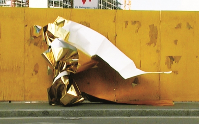 Devis Venturelli Continuum, IT, 2008, 6', SD videoSekvenca u dugom kadru prikazuje tijelo prekriveno zlatnim papirom koje se preobražava u gradski prostor. Pokretne strukture prolaze kraj gradilišta i istražuju neformalnu dimenziju arhitekture.